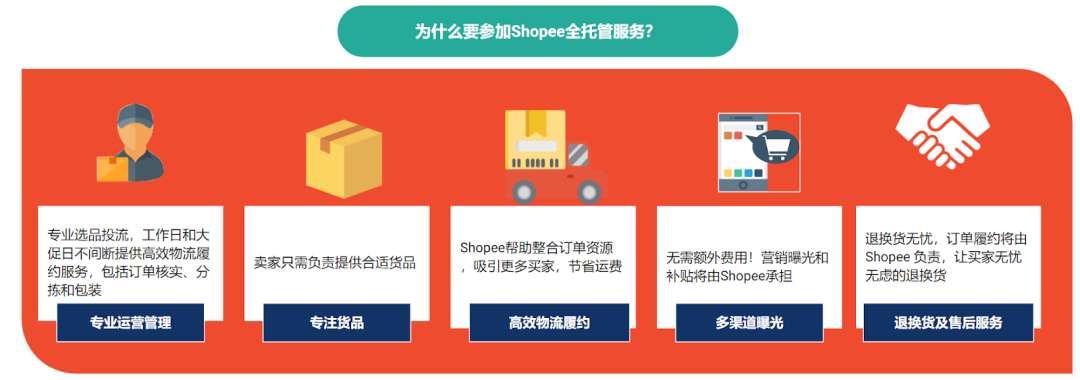 Shopee 全托管服务 (Shopee Fully Managed Service )是一项免费的全托管服务。该服务能有效帮助商家降低运营成本,也能让商家节省更多精力,以最佳成本专注于市场动态和产品选择。Shopee的专业团队将有效控制市场运营、物流履约和售后服务。